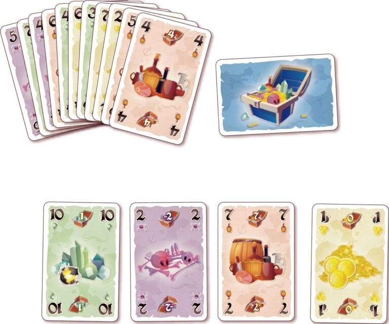 このゲームには4つのスート(金貨/ラム酒/クリスタル/呪い)の40枚のカードからなり、各カードには強さの値と戦利品の値が表示されます。