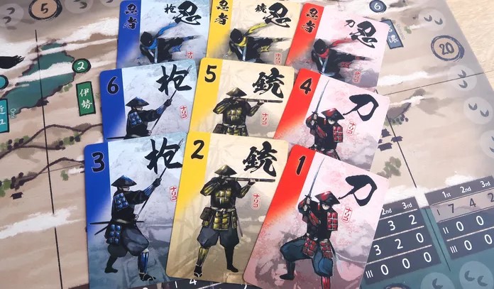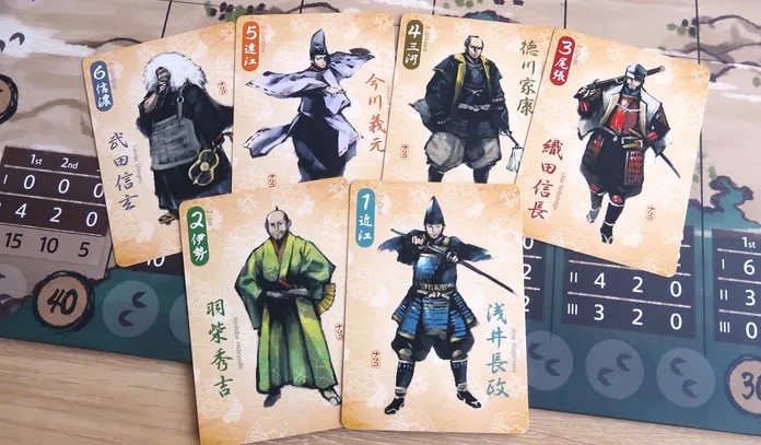 各プレイヤーは色を選び、大名コマと武将コマを持ち、大名カードはよく切ってその地域に置きます。