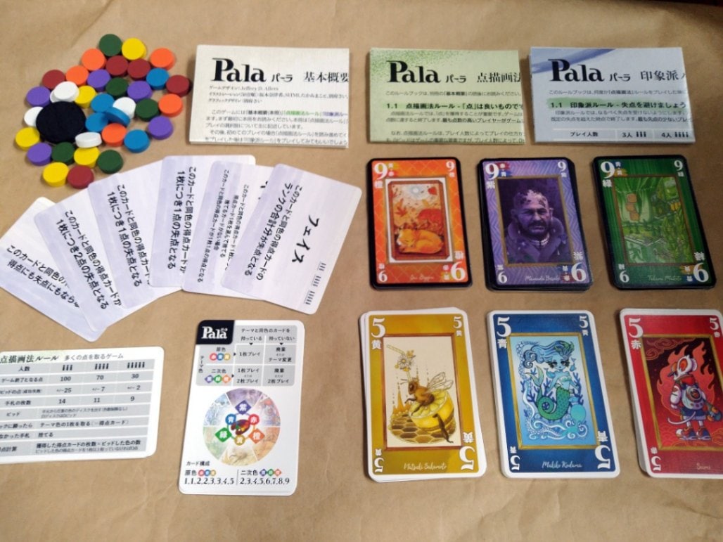 「パーラ」は、美大生となり、パレットの上で顔料を混ぜて、キャンバスにふさわしい色を出すことをテーマにしたトリックテイキングゲームです。