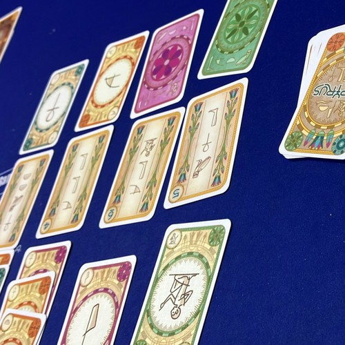 解読依頼カードの達成や、パピルスカードの上下にヒエログリフカードを出していくことで点数を獲得します。