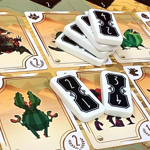 カードはボードに置かれます。手番ごとに、プレイヤーはドミノのペアを使って座標を作り、ボード上の対応するカードをとります。