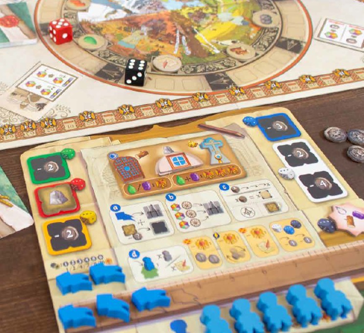 中央のロンデルでは、プレイヤーは使いたいダイスを選び、そのダイスの上側に示されているスペースの数だけ前進し、ダイスが指定したスペースに示されている資源を手に入れることができます。