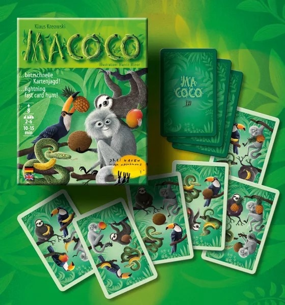「マココ」では、動物および果物の種類と数をカードを見て把握し、できるだけ早く判断して宣言し、カードを手に入れることを目指します。