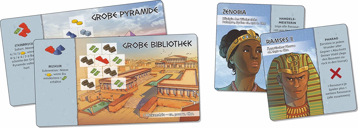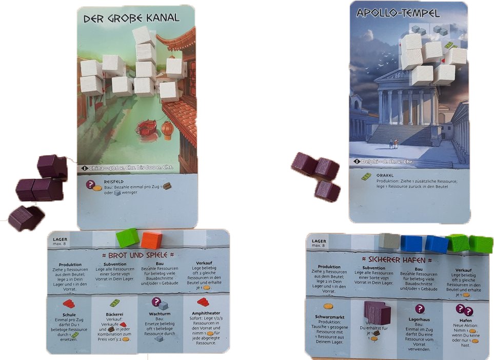 このゲームでは、各プレイヤーが古代世界の驚異を示すカードと、それを支える建物のセットを受け取ります。
