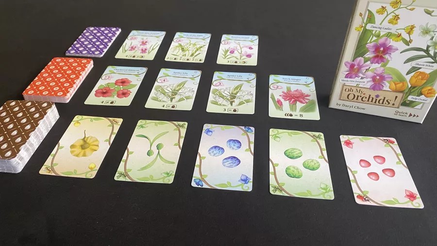 「オーマイオーキッド」は、造園業者となり、種を集めて花を咲かせる、手札管理ならびにセット形成のゲームです。