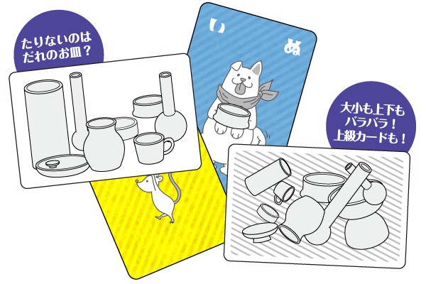 お皿の大小・上下もバラバラの上級カードや、動物たちがお皿を交換してさらに難しく遊べるルールも入ります。