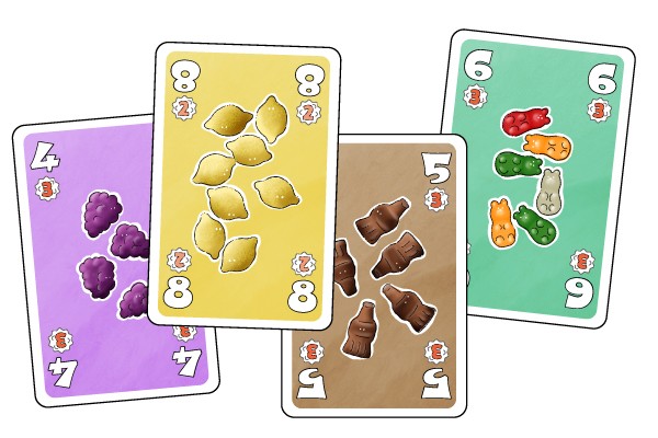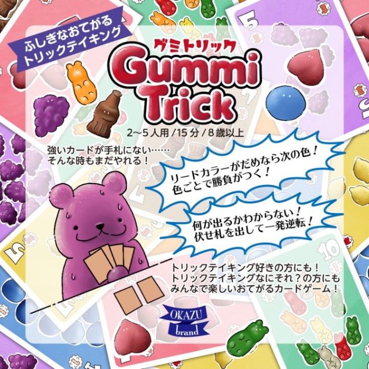 「グミトリック」は、各トリックでカードの色ごとに勝者を決定するトリックテイキングゲームです。