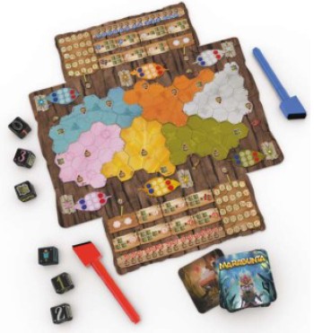 「マラブンタ」で、アリのコロニーの構築をテーマにした、2人用の分割ドラフトとエリアの取り合いのダイスロール&ライトのゲームです。