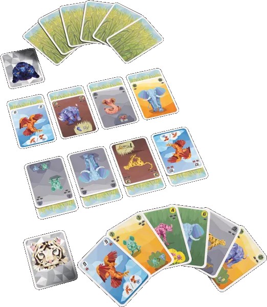 カードデッキは28枚で構成され、24枚の動物カードに6までの数字の4つのスートと、4枚のイーグルカードが書かれた5つ目のスートがあります。