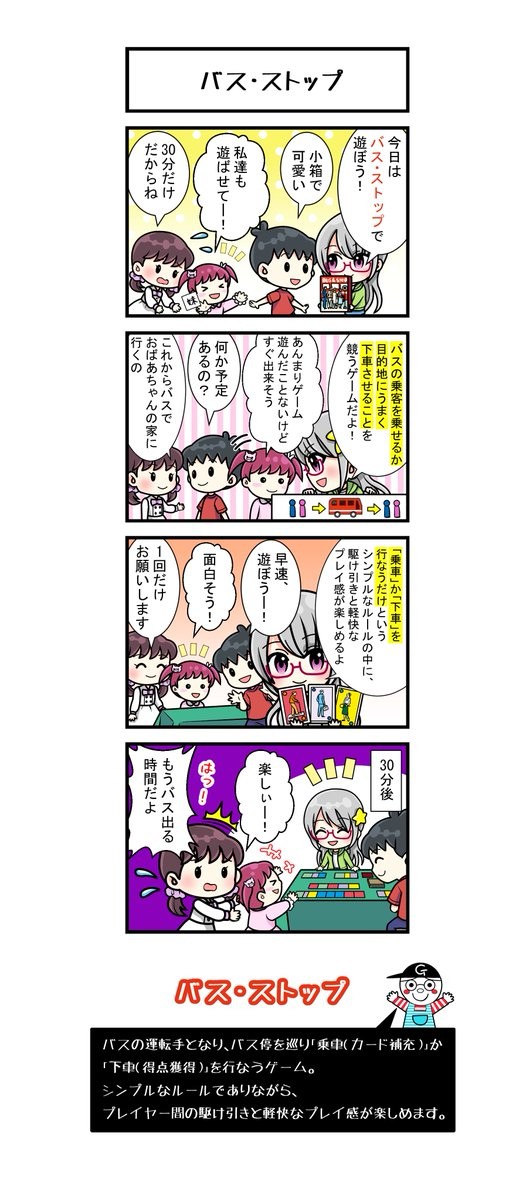 「バス&ストップ」は、バス路線管理者になって、混雑を避けながら乗客を目的地まで運ぶことを競うカードゲームです。