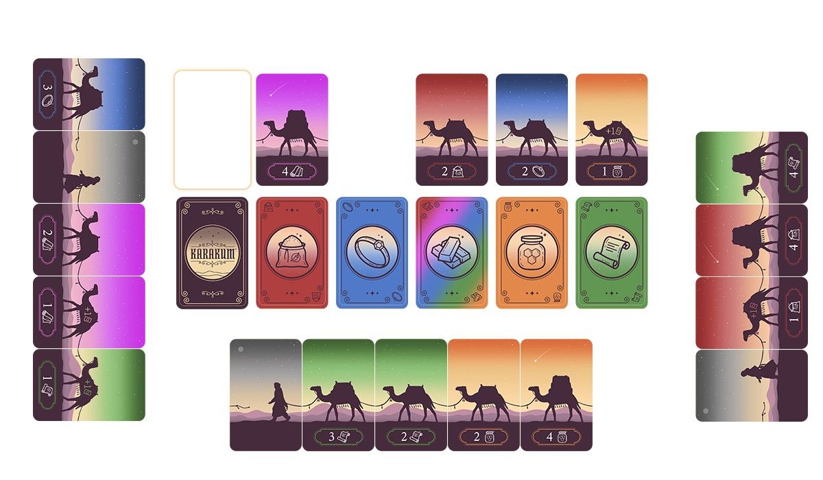 「カラクム」は、プレイヤーが資源を集め、キャラバンのためのラクダを獲得するオープンドラフトカードゲームです。
