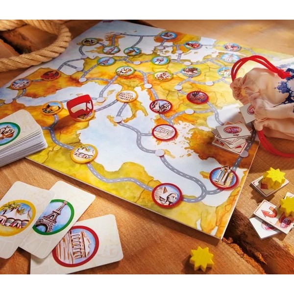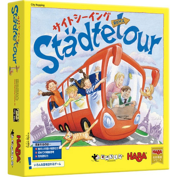 「サイトシーイング」は、1人ずつ順番にバスガイド役になり、袋から引いたチケットに書かれた指示にしたがいバスを進め、自分の目的地を目指すゲームです。