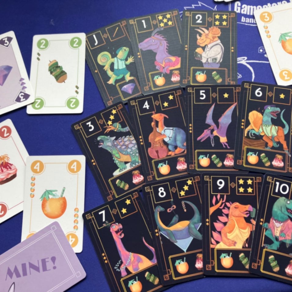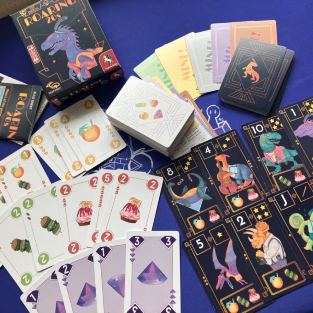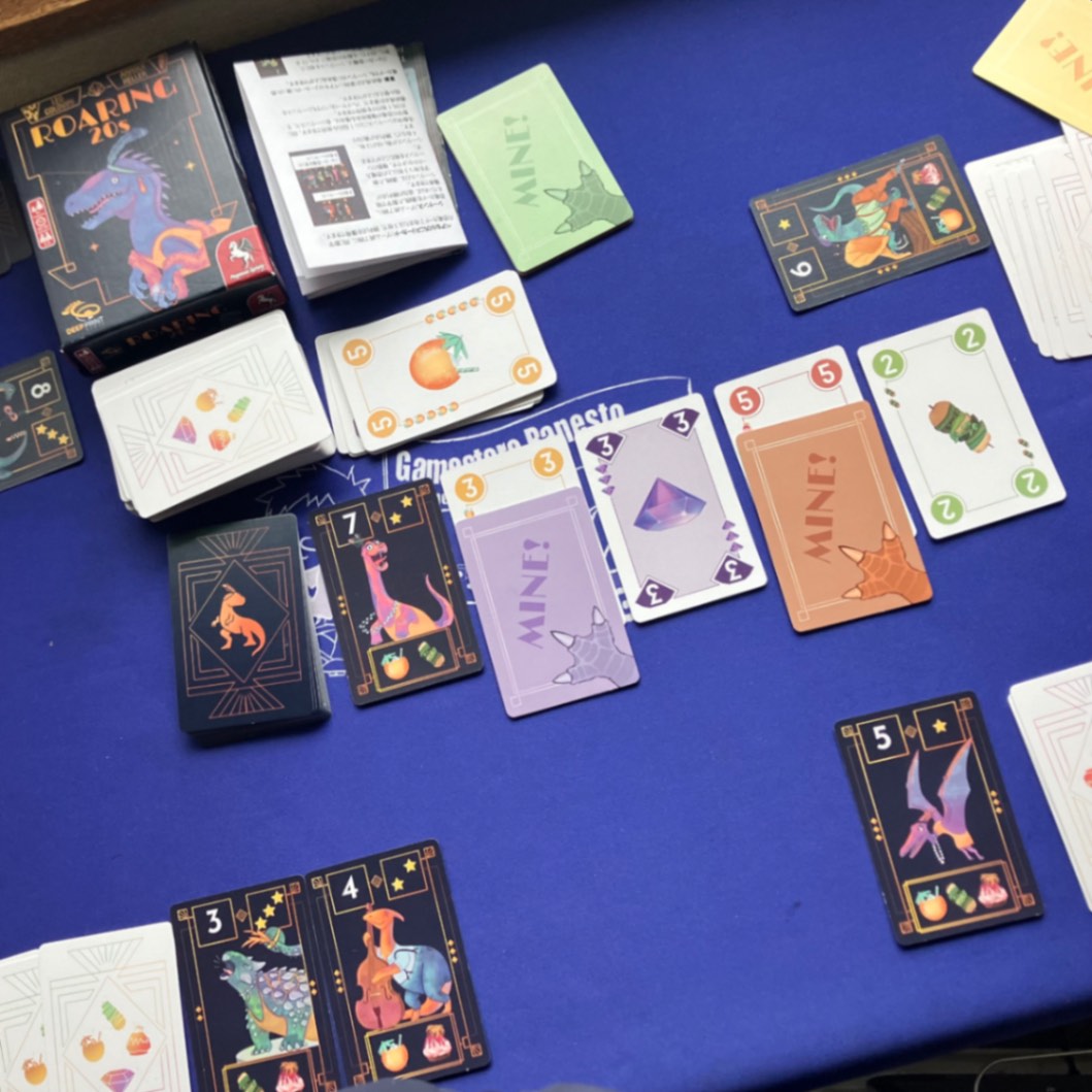 「ロアリング・トゥエニーズ」は、恐竜が好むスナックと宝石で、クールな恐竜たちを自分のテーブルに誘い込む、入札ゲームです。