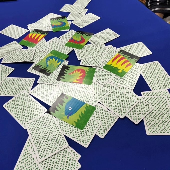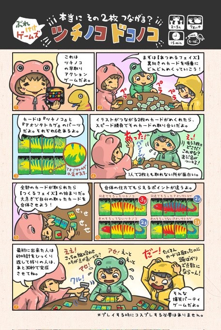 「ツチノコドコノコ」は、次々とめくられるカードの中からつながる2枚を見つけて早取りするスピードアクションゲームです。
