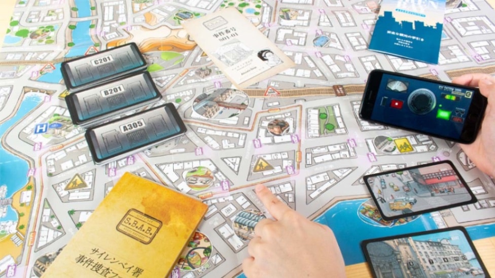 事件の手がかりは、音声データと街の監視カメラの画像、広い地図です。スマートフォンアプリで事件発生時の音声を再生し、犯人の会話や周囲の音を分析。例えば、「踏切の音がするから、犯人はこの道を通ったのでは?」といったヒントを元に推理します。時にはカメラ画像が有力な手がかりになることも。全員で協力し、事件解決のための問いに答えます。