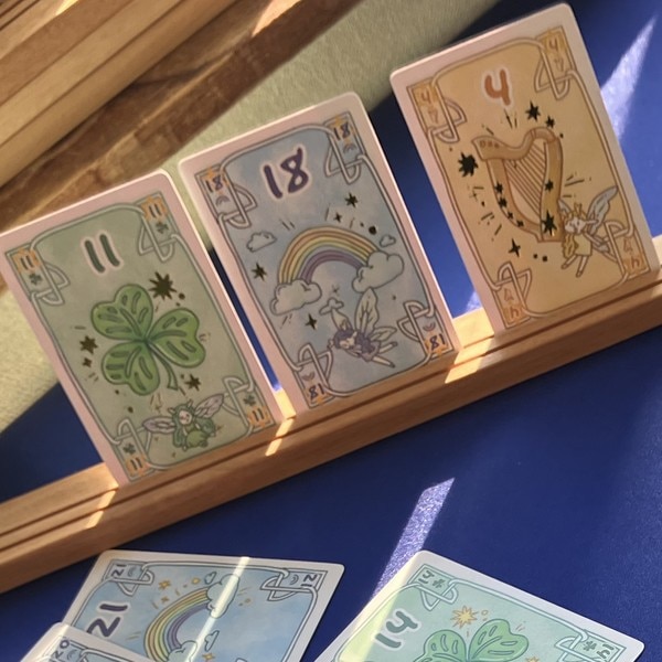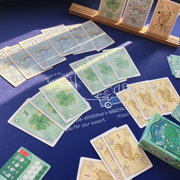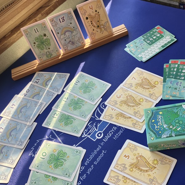 「フェアリー」は、ジェスチャーを使って次のカードの数値、色、3枚ある妖精からいまあるカードからめくられるカードの関係性を予想するゲームです。