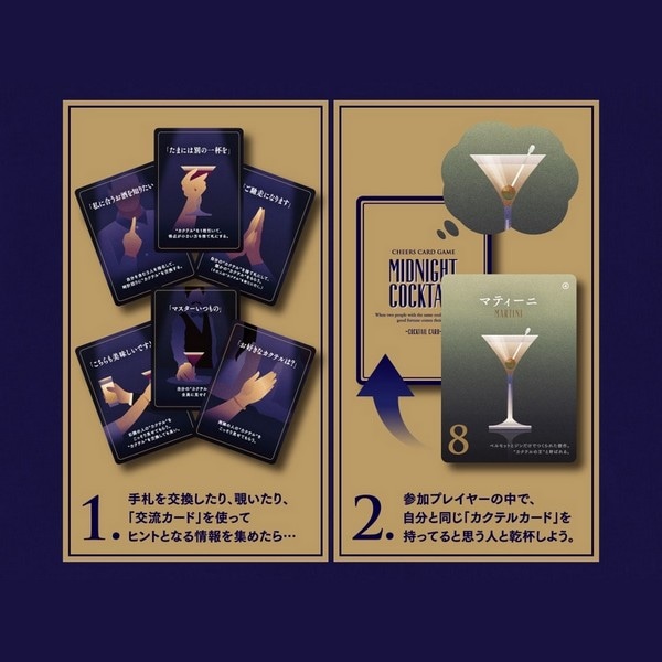 「ミッドナイトカクテル」は、手札の見えない暗闇のBARで、自分と同じカクテルを持つ相手と乾杯を狙う 推理×戦略ゲームです。