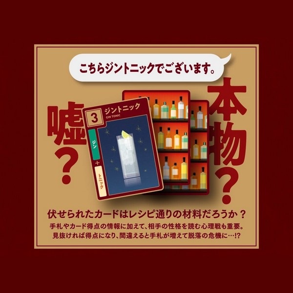 「バーテンダウト」は、嘘の混ざったカクテルを見抜いて、バーテンダーとしての評価を集めるブラフ×コレクションゲームです。