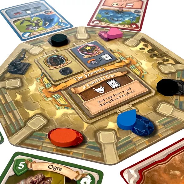 このゲームは戦略的なボードゲームで、プレイヤーは八角形のダンジョンボードの周りにクリーチャーカードを表向きと裏向きで配置し、貴重な魔法のアーティファクトと宝石のセットを集めることを目指します。