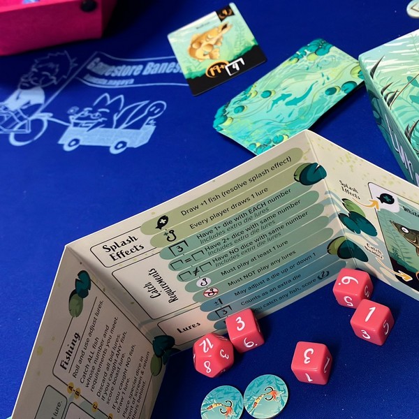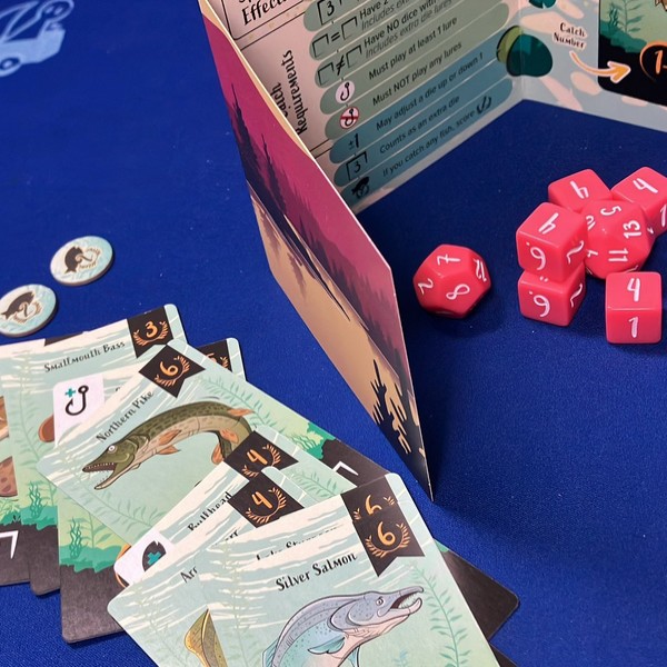 魚を釣り上げるには、ダイスを振ってその魚の目標数字を出し、カードに書かれた特定の条件を満たします。