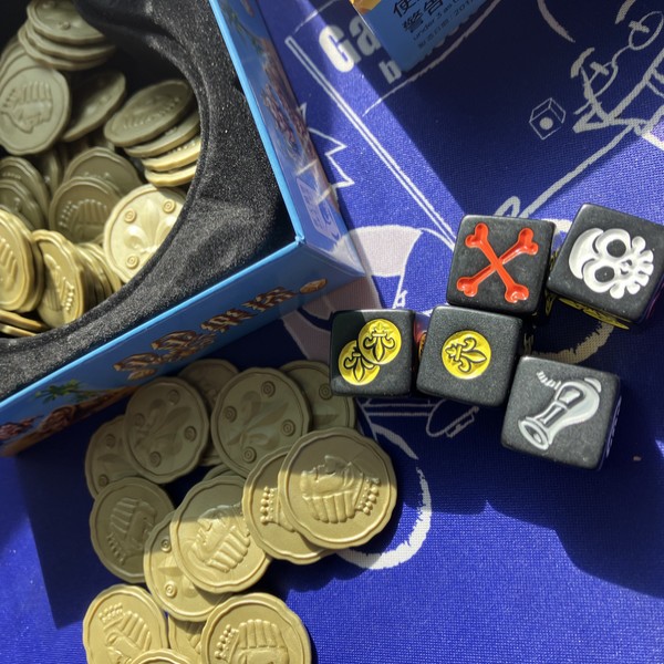 5個のダイスすべてにドクロを出す: 他のプレイヤーからコインをすべて奪う。5個のダイスすべてに大砲を出す: 箱からすべてのコインを取り、ゲームを終了する。