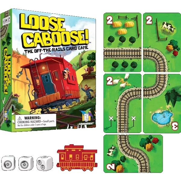 このゲームは55枚のカードと4つのカスタムダイス、木製の車掌車のフィギュアで構成されています。