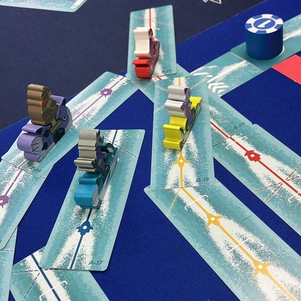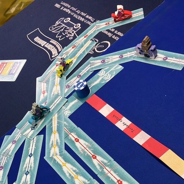 スピードや曲がる角度が異なるカードをコースに合わせてうまくつなぎ自分のコマを走らせます。