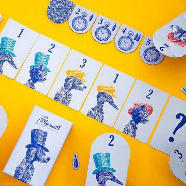 カードには、3種類の動物のうち1つと、3種類の帽子のうち1つ、さらに上部には1から5までの数字のいずれかが描かれています。プレイヤーはその列の続きを考えて、このカードがふさわしいと思う1枚をひそかに選びます。