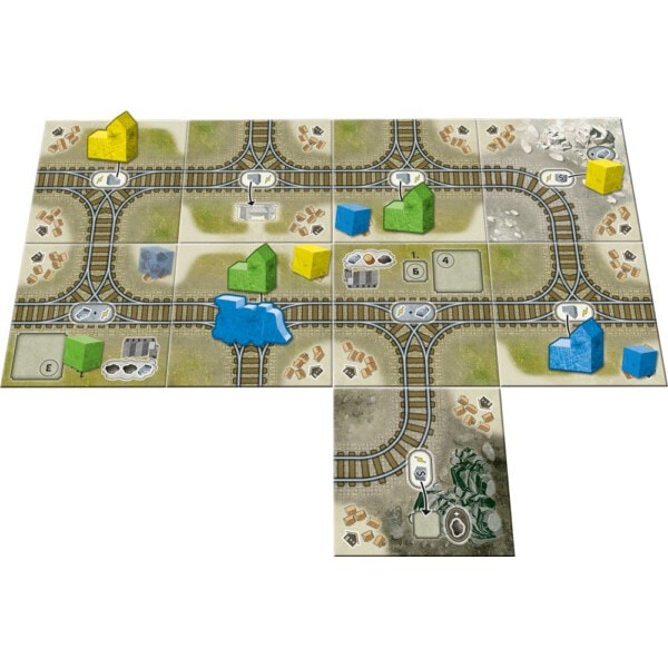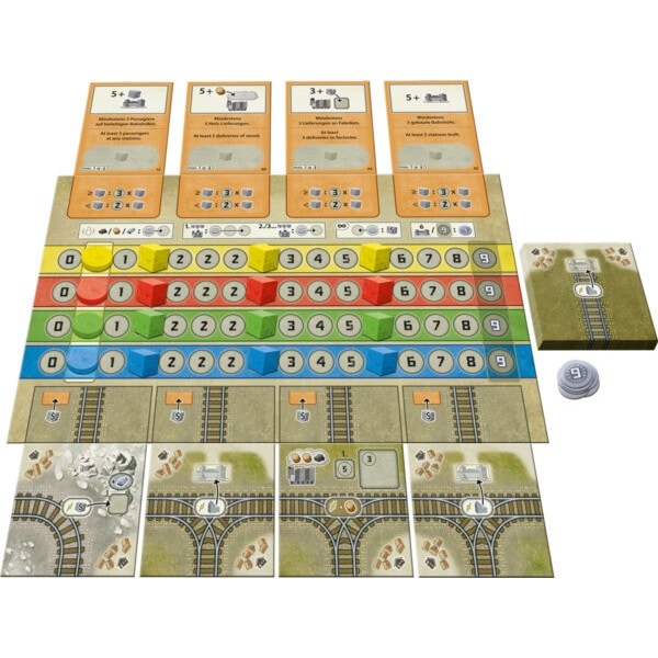 各プレイヤーに初期手札として3枚の線路タイルを配り、残りのタイルは山札とします。目標カードを4枚選び、メインボードに並べ、各プレイヤーは株価ディスクとキューブを所定の位置に配置します。スタートプレイヤーを決定し、マーカーを渡してゲーム開始です。