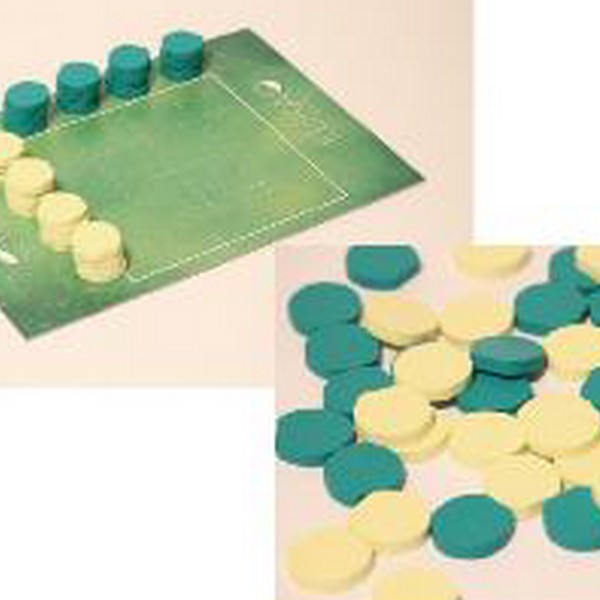 プレイヤーは交互に、ボード上のトークンの山のうち、自分の色が一番上になるものを選びます。