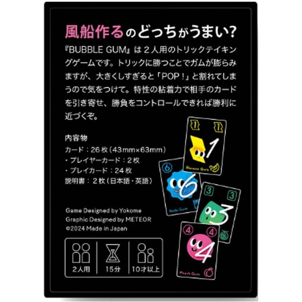 「バブルガム」は、風船ガムの膨らませをテーマにした2人用のトリックテイキングゲームです。