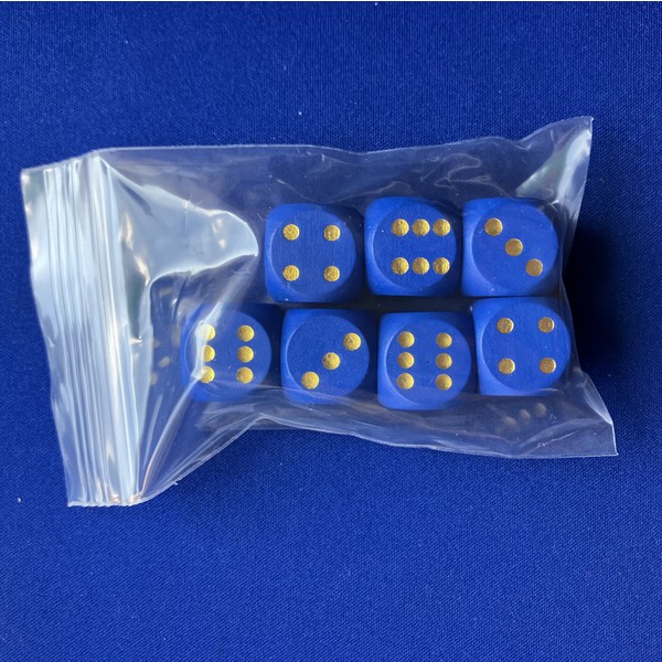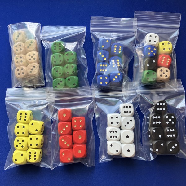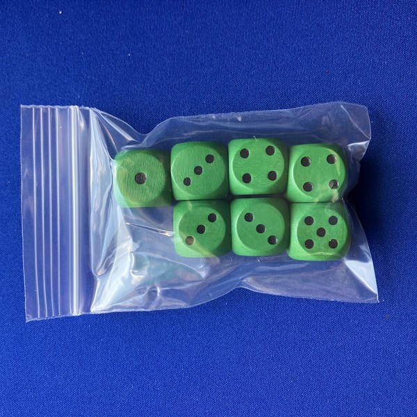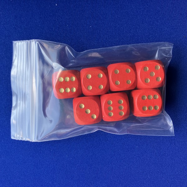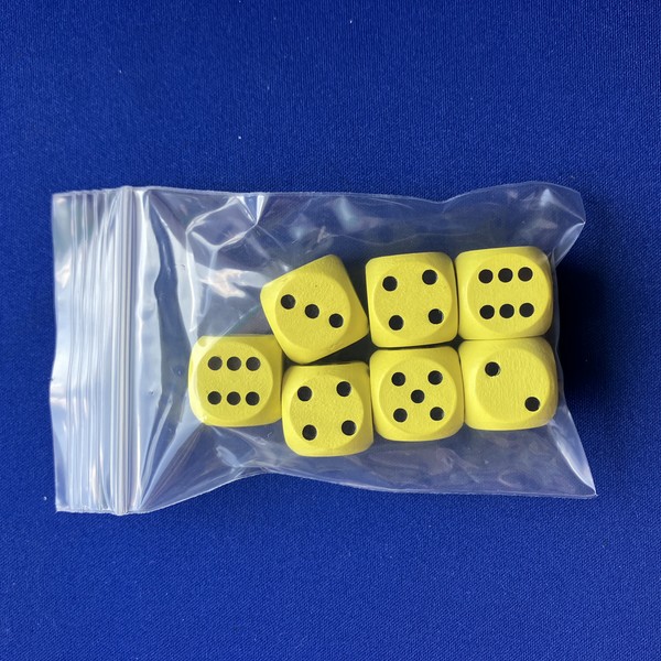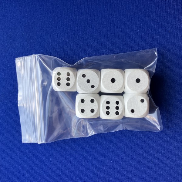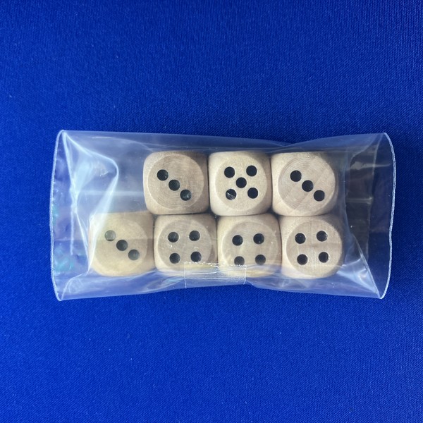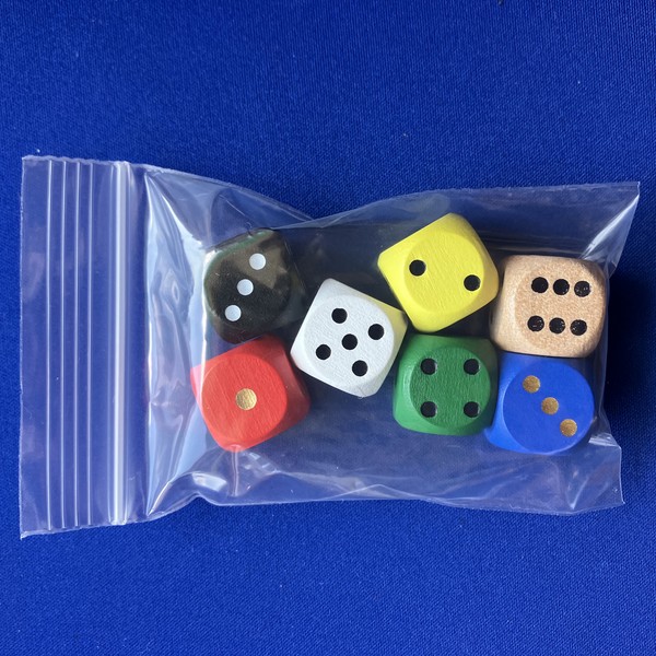 木製D6ダイスの7個セットです。袋入り。大きさは16mm。色は赤/青/黄/緑/黒/白/木。