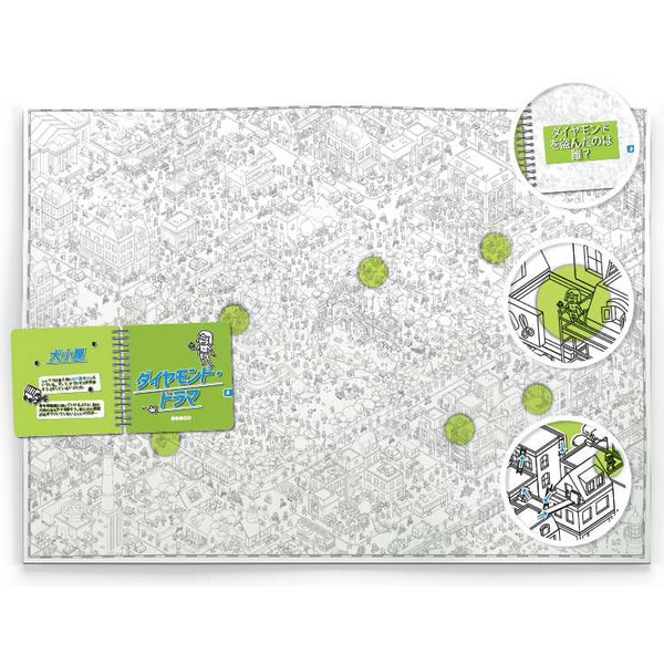 課題は町全体を表す大判の地図上に描かれている場面を見つけることで解決となります。課題を順番に解決することで捜査は進み、最後のページの課題の解答を見つけると、その事件は解決となります。