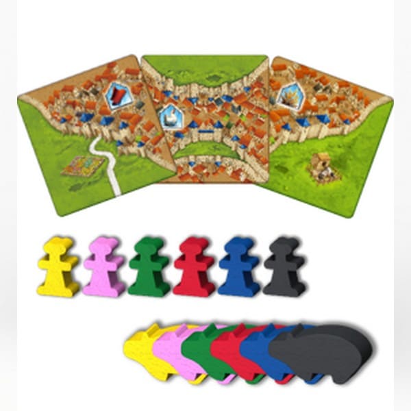 この拡張セットに、拡張セット1のピンクのミープルを加えることで、6人で遊ぶことも可能です。