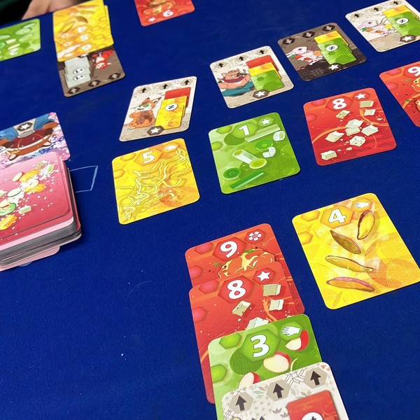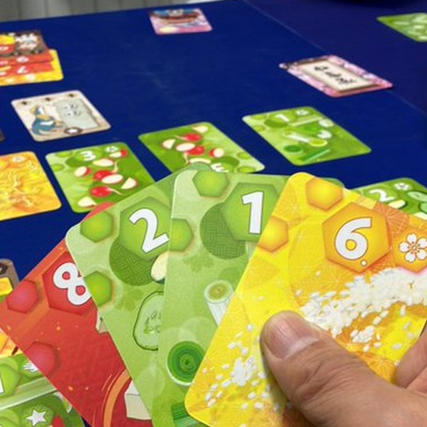 手番では手札から1枚、市場から1枚の食材カードをプレイし、最大5種類の料理(各3枚構成)を作成します。なお必要に応じて料理内のカードを交換できます。