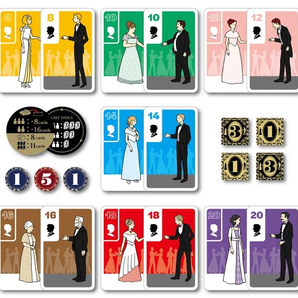 ゲームには7色のダンサーが登場し、各色カードの前半に女性、後半に男性が描かれています。
