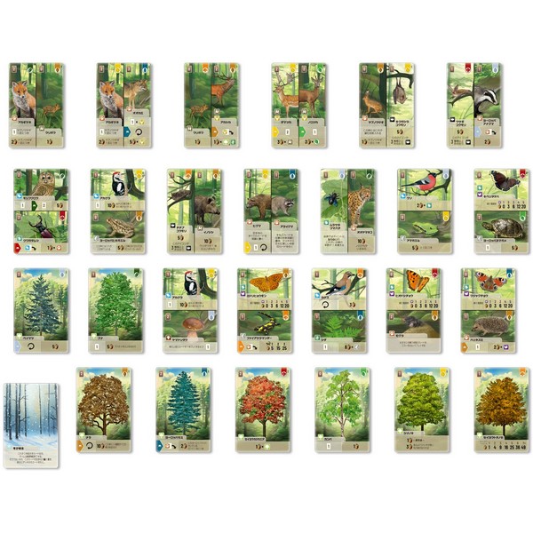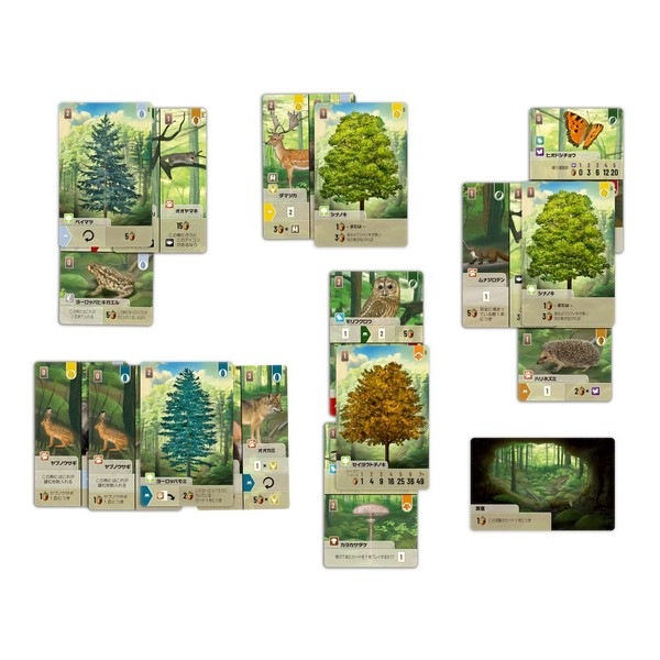 カードは森の基本となる樹や低木や湿原などの地形、それらの持つスペースに生息する、上下もしくは左右に分割された別々の生物の描かれたカードがあります。