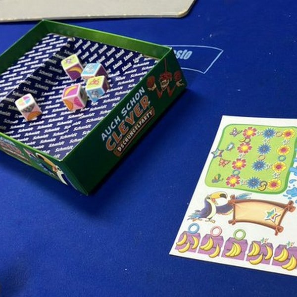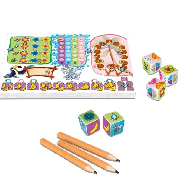 「クレバー・ジャングルパーティ」は、ギフトや虹色の星が得られるパーティーグッズを、できるだけ多く手に入れるロール&ライトゲームです。