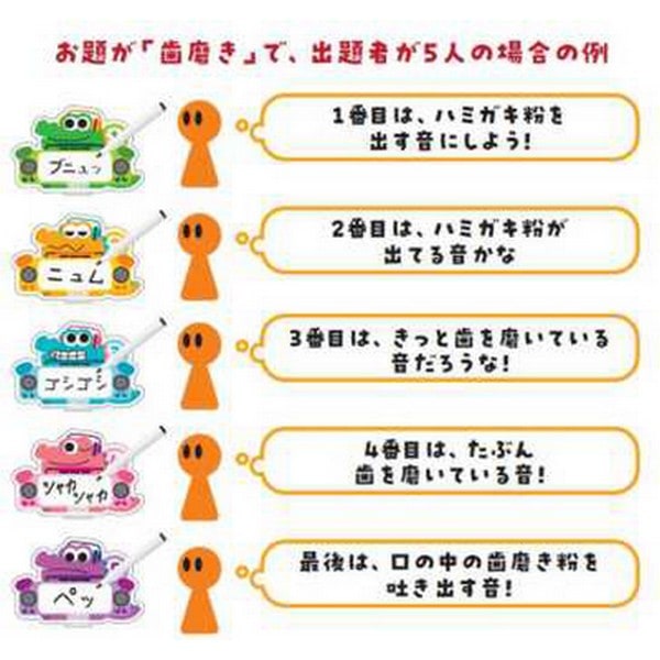 この出題者1人が表現できるのは、お題となったできごとの一部分の音だけで、それがつながることで表されます。