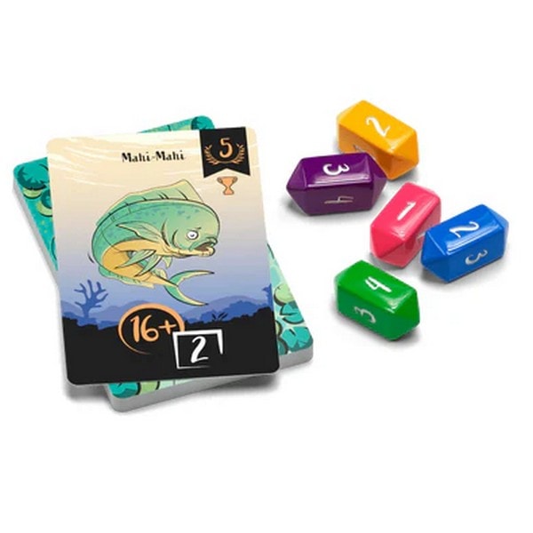 「ルアー拡張:深海」は、ダイスを振って魚を釣ります。そのため入札を低くして、より早く釣り上げることを目指すゲームの拡張です。