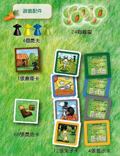 各プレイヤーの農夫を倉庫に置き、各プレイヤーは先に持った3枚のウサギと共にカードを5枚持ち、合計8枚でゲームをはじめます。