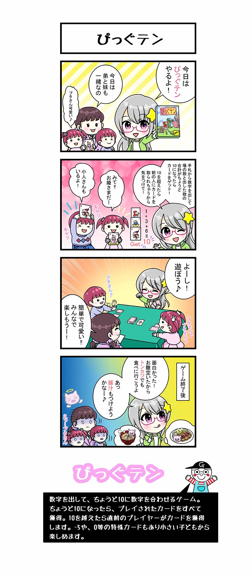 「ぴっぐテン」は、すべては「10」という数字が中心となり、こぶたさんのカードで10を見事に当てたプレイヤーにメリットがあるカードゲームです。