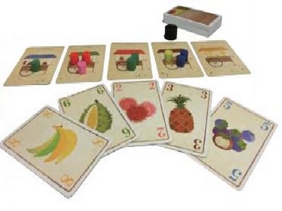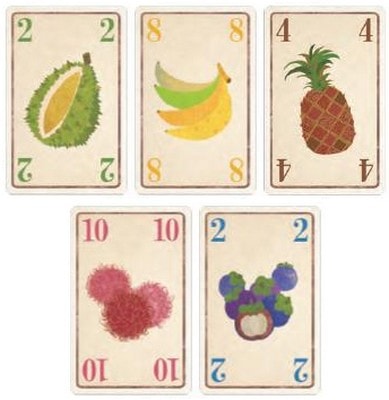 フルーツ・カードをシャッフルし、各プレイヤーに均等に配ります。加えて、各プレイヤーは色を選択し、その色のマーカーを9個ずつ受け取ります。