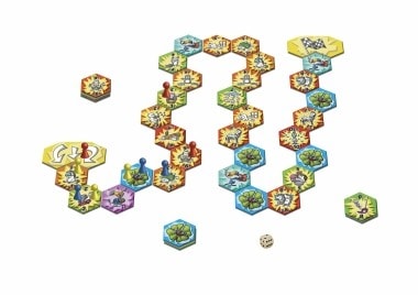 プラスやマイナスの得点が書かれたタイルを獲得しながら(獲得させられながら)自分の3つの駒を進める,すごろく系タイル・ゲームです。