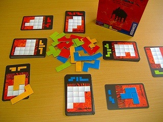 同時にプレイし、カードに書かれている形のタイルを取って、そこに書かれたマスをうまく埋めるように並べなくてはいけません。