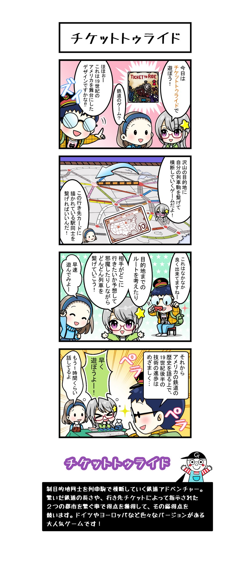 ゲームを選ぶ時はいろいろ情報を集めてから買うのですが,「乗車券」は存在を全く知らずに店頭で見つけ,一目惚れして買ったゲームです。後で「ドイツ年間ゲーム大賞」受賞作品だと知りましたが,納得のおもしろさ&お手軽さです。数多く出ている続編や拡張セットも,その人気の高さを裏付けていると思います。