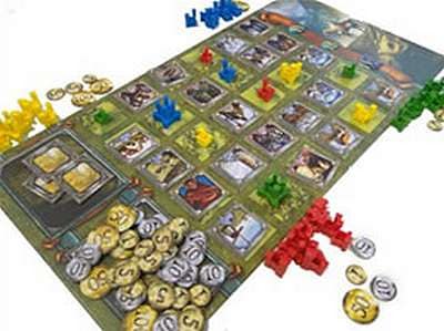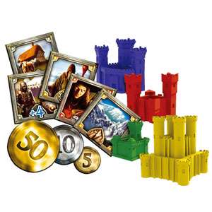 各プレイヤーは自分の色を決め、その色の城を定められた数だけ受け取ります。またタイルはすべてよく混ぜ、山札にします。各プレイヤーはお金を50受け取ります。