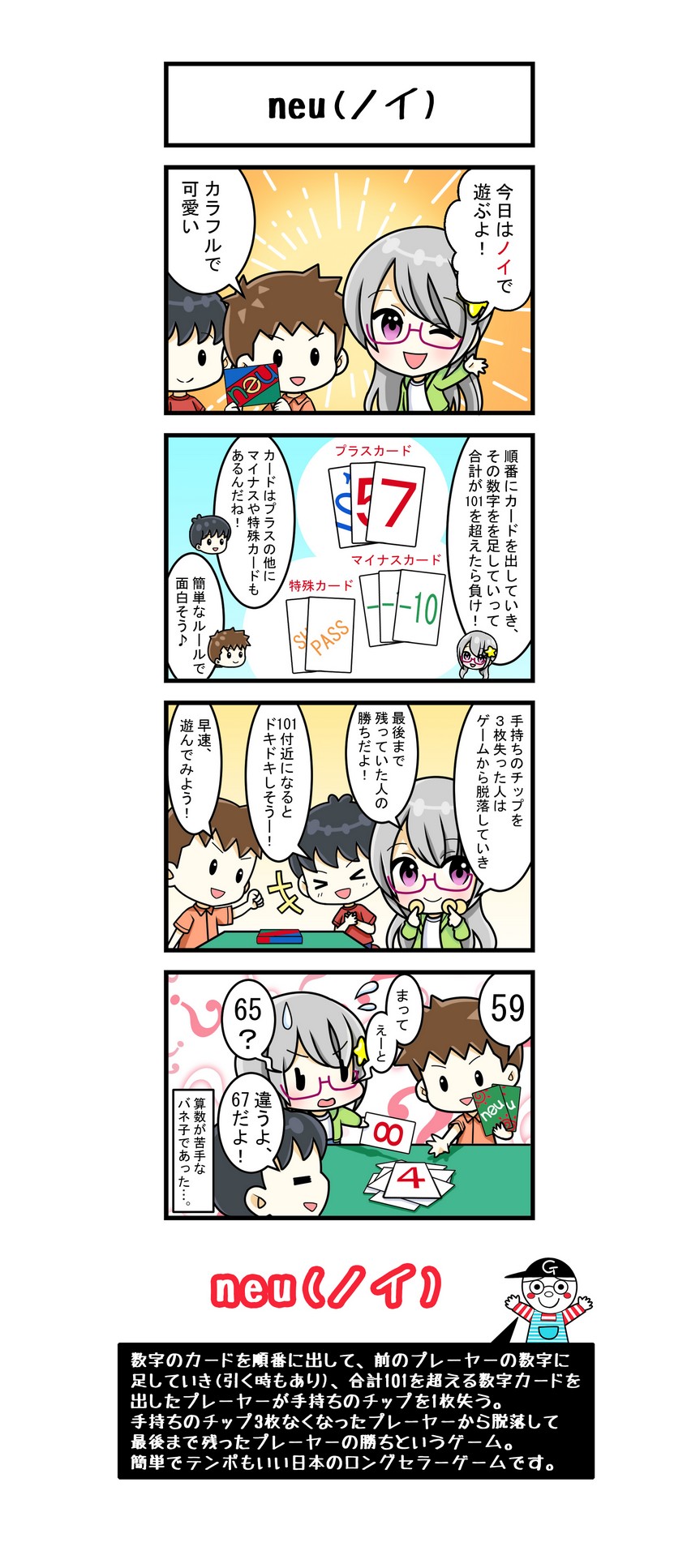 ただ場の数を増やす数字以外にも、いきなり101にしてしまうカード、自分の順番を飛ばすカード、順番が逆になるカード、次の人に2枚カードを出させるカード、誰かに順番を飛ばすカードなどアクションカードも多彩です。