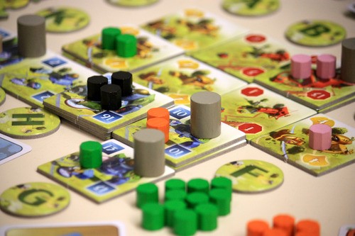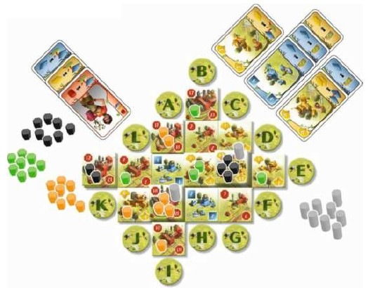 各色の1、2、3の建設タイルをランダムに四角に並べ、都市化マーカーをその四角の外側にアルファベット順に並べます。その他の建設タイルはよくシャッフルし、残りの建設タイルを伏せて山札を作ります。